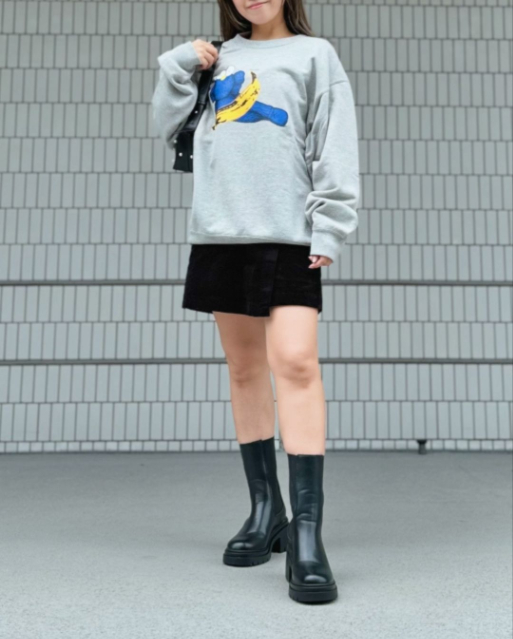 普段ミニ丈に抵抗がある方も、ロングブーツでスタイルをアレンジすれば挑戦しやすいでしょう。ブーツは、太めのロングブーツを選ぶことで、今っぽいスタイルに♪