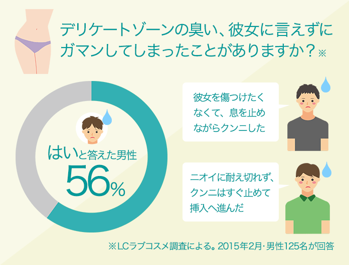 【LCラブコスメ】が行った調査によると、「女性のデリケートゾーンの臭いを彼女に言えずに我慢してしまったことがありますか?」という質問に「はい」と回答した男性は56%。