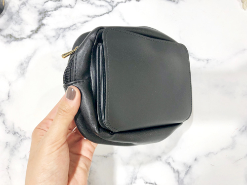 付属のミラーを立てて化粧ができる便利な機能が付いているので、朝の時短にもなるポーチです。
