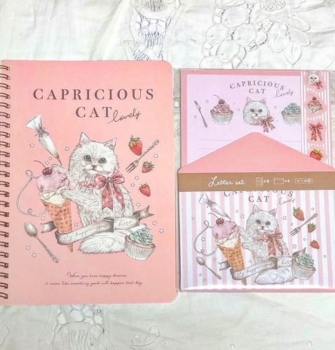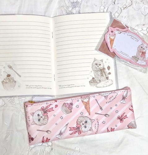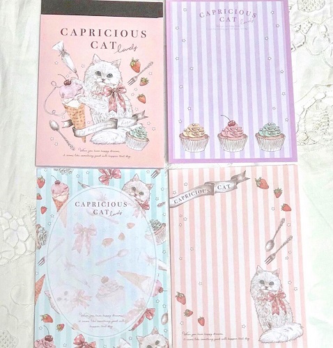 ミニサイズのノートは罫線&イラスト付きで、白猫やスイーツのイラストが描かれていますよ。