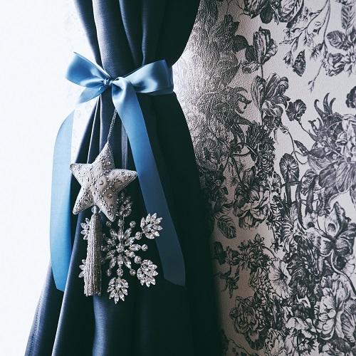 カーテンにクリスマスオーナメントを付ける飾りアイデア♪